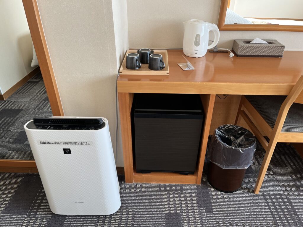 予約した人数分のペットボトルのお水(500ml)も付いていたり、ケトル、加湿器などもあったので冬の季節でも快適に過ごせそうなお部屋でしたよ。